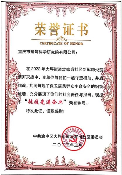 3月23日,大坪街道召開“疫”路有你,與愛同行——暨抗疫“最美黨員”表彰大會,為在2022年大坪街道袁家崗社區(qū)新冠肺炎疫情殲滅戰(zhàn)中表現(xiàn)優(yōu)秀的社會團(tuán)體與個(gè)人頒發(fā)榮譽(yù)證書,市建科院公司獲“抗疫先進(jìn)企業(yè)”榮譽(yù)稱號。