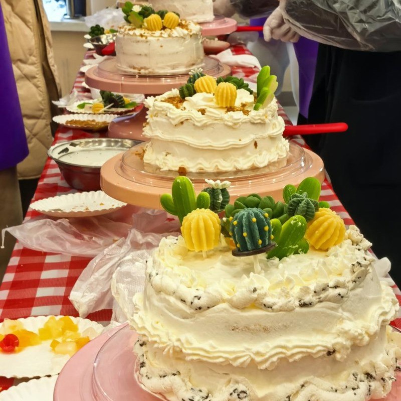 活動特邀專業烘焙師全程指導,現場宛如專業烘焙工坊,轉臺、抹刀等專業器具及新鮮食材一應俱全。烘焙師現場示范蛋糕制作的抹面技法,重點講解裱花技巧、裝飾布局等實操要點。女職工分組操作,通過奶油調色、裱花造型等創意實踐,完成各具特色的節日蛋糕。現場此起彼伏的交流聲與歡笑聲中,既有裱花失誤引發的趣味互動,也不乏驚艷造型收獲的集體贊嘆。制作完成后,女職工們攜作品合影留念,并將成品封裝帶回家中分享。