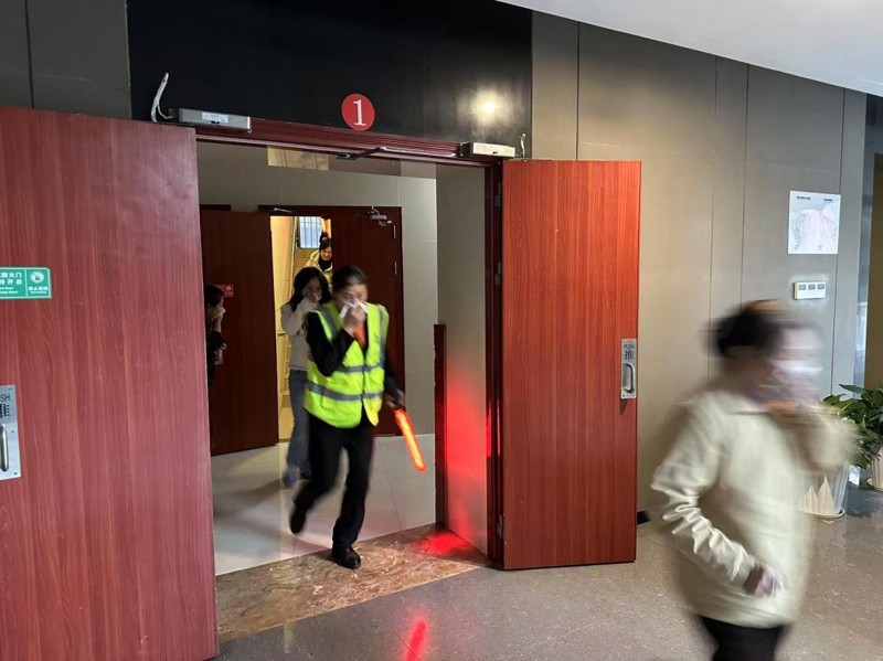 理論培訓現場,一陣急促的警報聲突然響起,火災緊急疏散演練正式開始。模擬火災場景設定為辦公區因不明原因起火,引燃周邊可燃物,致使火勢迅速擴大,并向樓層四周及建筑上層蔓延。現場工作人員發現火災后,立即按下火災報警裝置并按報告程序,建科大廈火災警報、消防卷簾門等消防設施瞬間聯動。應急領導小組收到報告后立即啟動消防應急預案,各應急小組各司其職,火速奔赴現場展開搶險。在樓層安全員的精準指揮引導下,各樓層員工快速反應,沿著正確的疏散路線有序撤離至安全集合點。